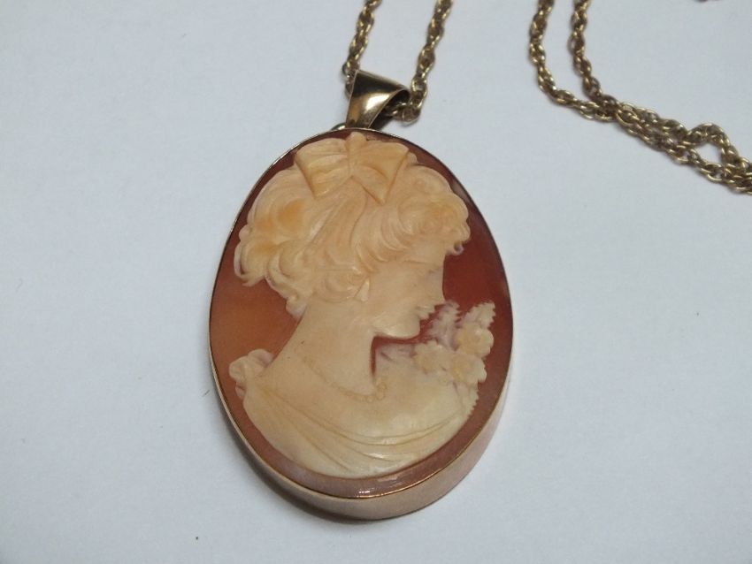 AN OVAL CAMEO PORTRAIT PENDANT IN 9CT GOLD MOUNT, cameo H 4.2 cm, suspended on a yellow metal chain stamped 9ct to clasp, the chain approx 5.1 g, combined weight 16.4 g
