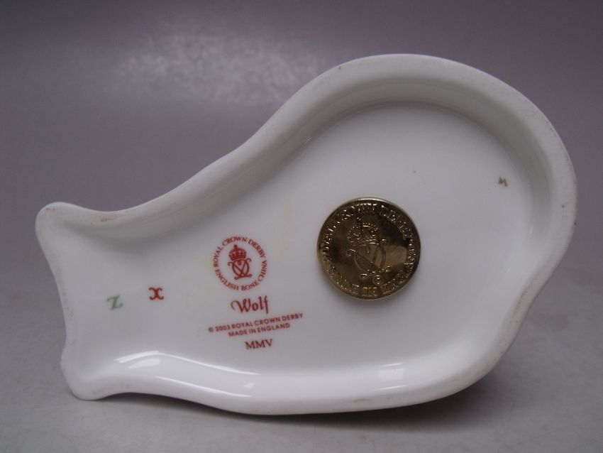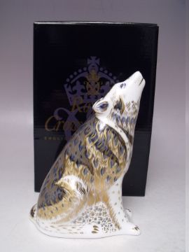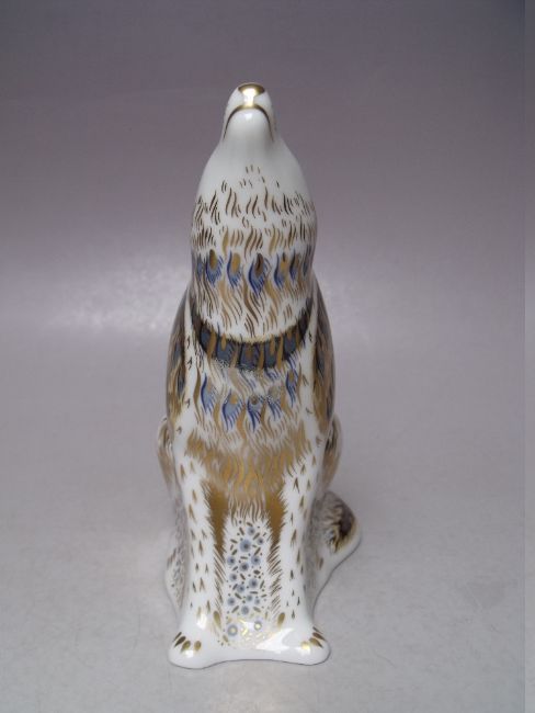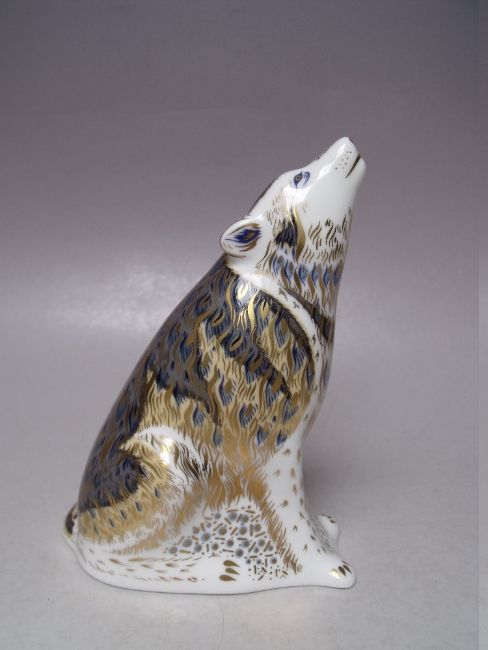 A ROYAL CROWN DERBY WOLF PAPERWEIGHT, gold stopper, with box, H 14 cm