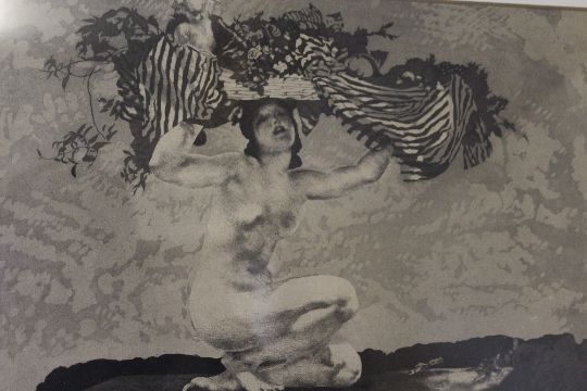 CHARLES SIMS (XX). Study of a female nude with basket of various items on her head, signed in pencil lower right, etching and lithograph on paper, framed and glazed, 24 x 34 cm