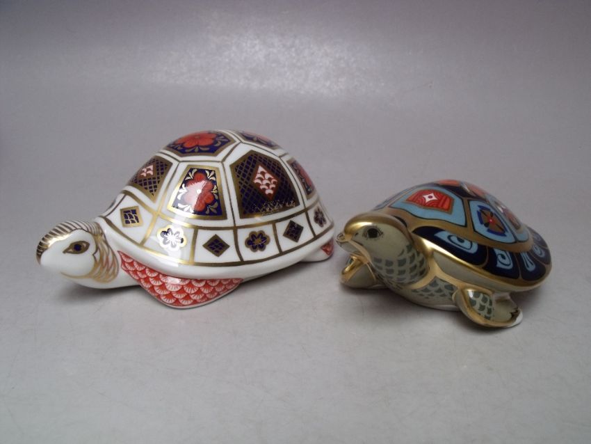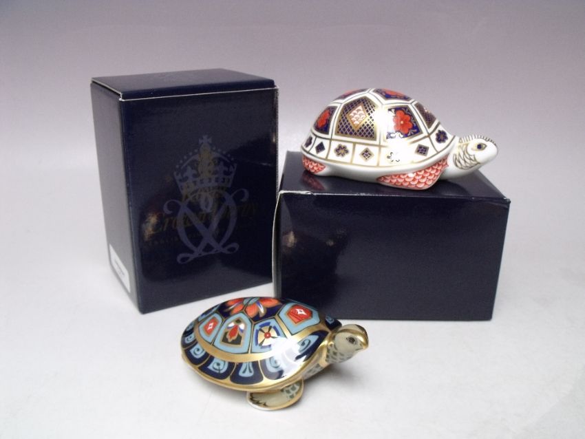 A ROYAL CROWN DERBY IMARI TURTLE PAPERWEIGHT, gold stopper, with box, L 12.5 cm, together with a Royal Crown Derby Terrapin paperweight, silver stopper, associated box (2)
