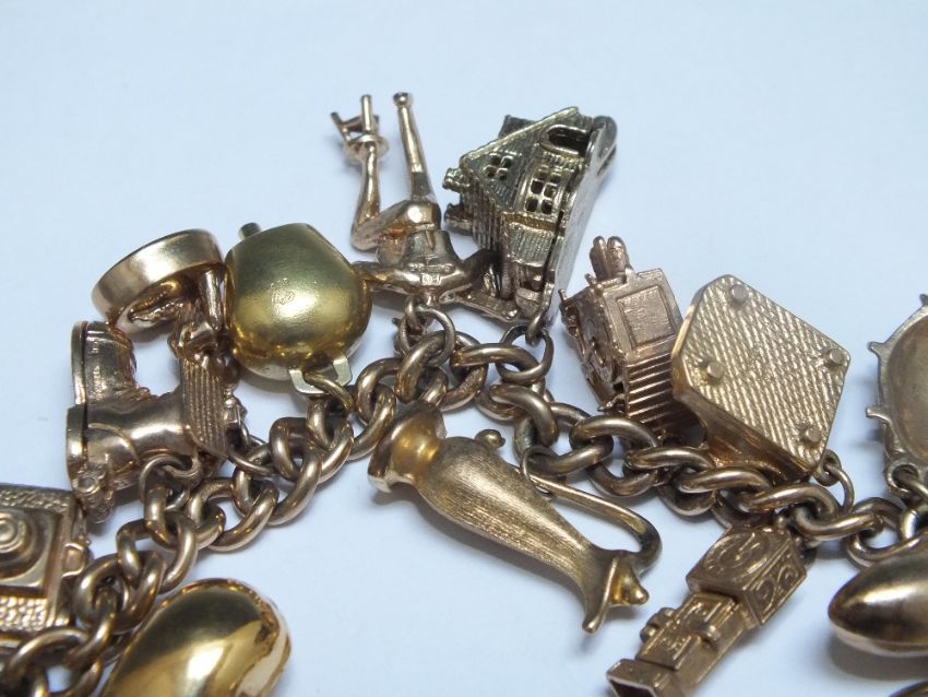 A HALLMARKED 9 CT GOLD CHARM BRACELET, approx weight 79.2g