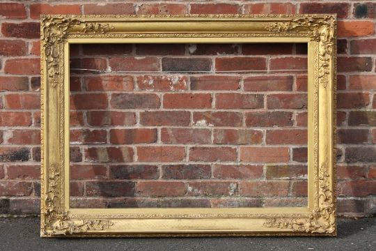 A 19TH CENTURY DECORATIVE GOLD FRAME WITH CORNER EMBELLISHMENTS AND GOLD SLIP, frame W 10 cm, slip rebate 77 x 110 cm, frame rebate 82 x 115 cm