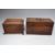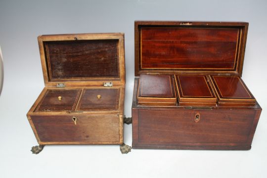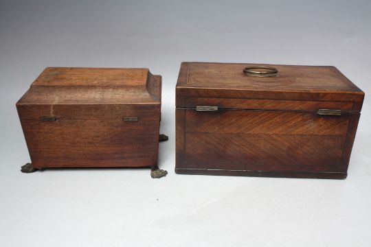 A 19TH CENTURY MAHOGANY TEA CADDY, three lined compartments, herringbone design to rear, W 25 cm, H 14 cm, D 13 cm, together with a smaller mahogany example, raised on brass claw feet A/F (2)