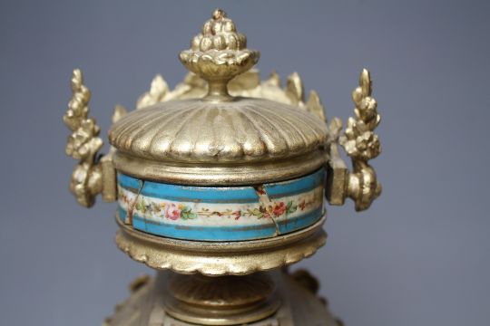 A 19TH CENTURY GILT METAL AND PORCELAIN FRENCH MANTEL CLOCK, of classical outline with urn finial, the porcelain panels painted with cherubs, the movement stamped Henry Marc, raised on a shaped plinth, pendulum, H 39 cm (excluding plinth) A/F