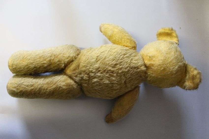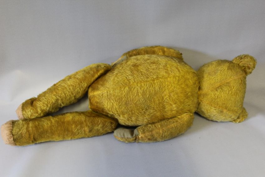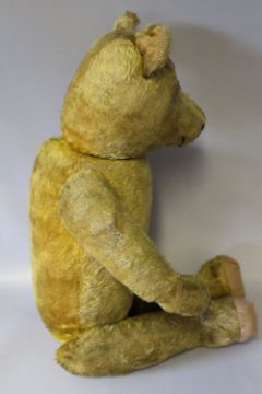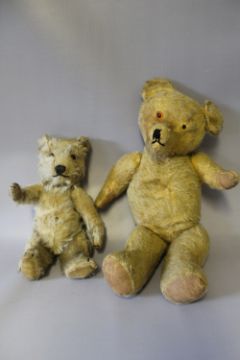 A LARGE VINTAGE PLAYWORN MOHAIR TEDDY BEAR, possibly Farnell or similar, jointed limbs with broad shoulders and large feet, hump and inoperative squeaker, H 69 cm, together with a smaller vintage teddy bear, H 46 cm and a Chiltern Hug Mee bear, H 28 cm (3)