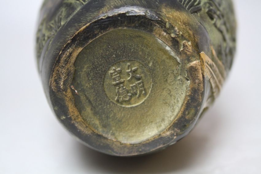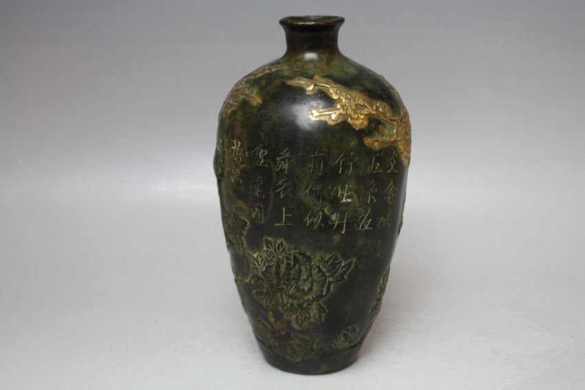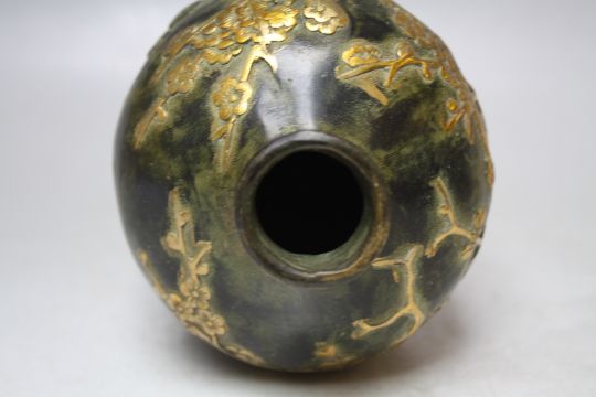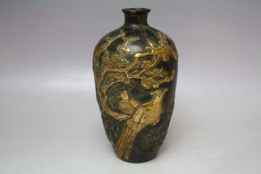 AN UNUSUAL ORIENTAL BRONZED BALUSTER VASE, decorated in gilt relief with mythical birds amongst foliage, incised characters to the reverse, four character mark to the base, H 19.5 cm S/D