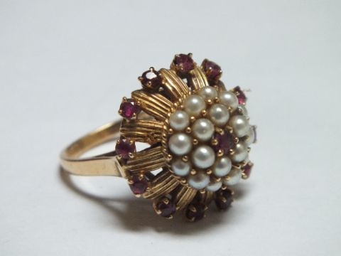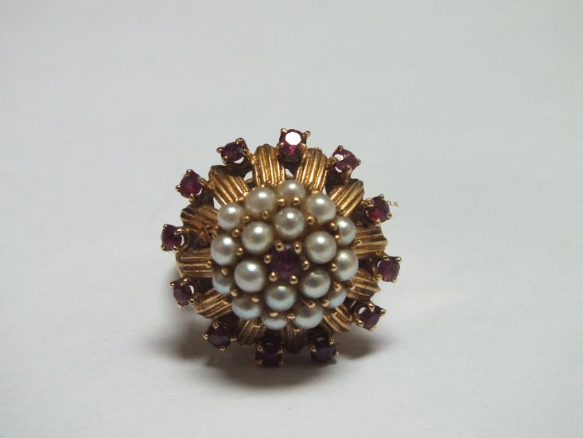 A HALLMARKED 14CT GOLD SEED PEARL AND GEMSET DRESS RING, ring size O, approx 7.7 g