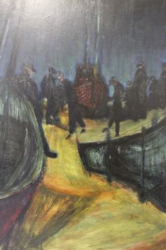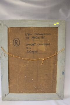 KEN TOWNSEND (XX). harbour scene with boats and figures 'Night Landing', see verso, signed lower right, oil on board, framed, 76 x 54 cm