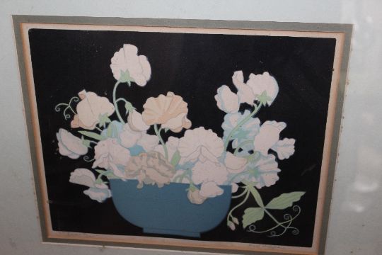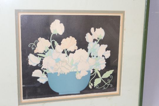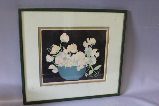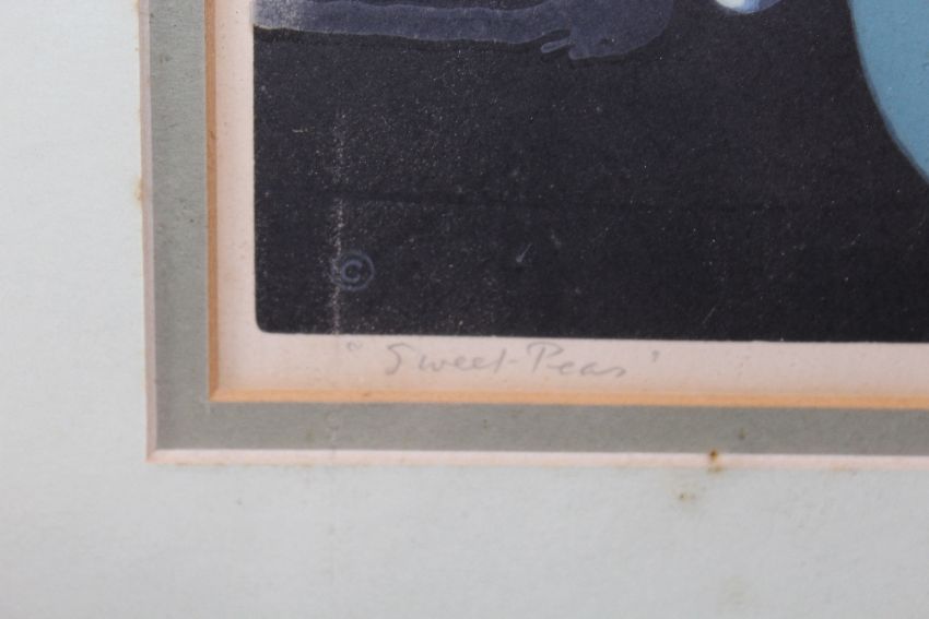 JOHN HALL THORPE (1874-1947). Still life study of flowers in a vase 'Sweet Peas', signed in pencil lower right, coloured woodcut on paper, framed and glazed, 25 x 30 cm