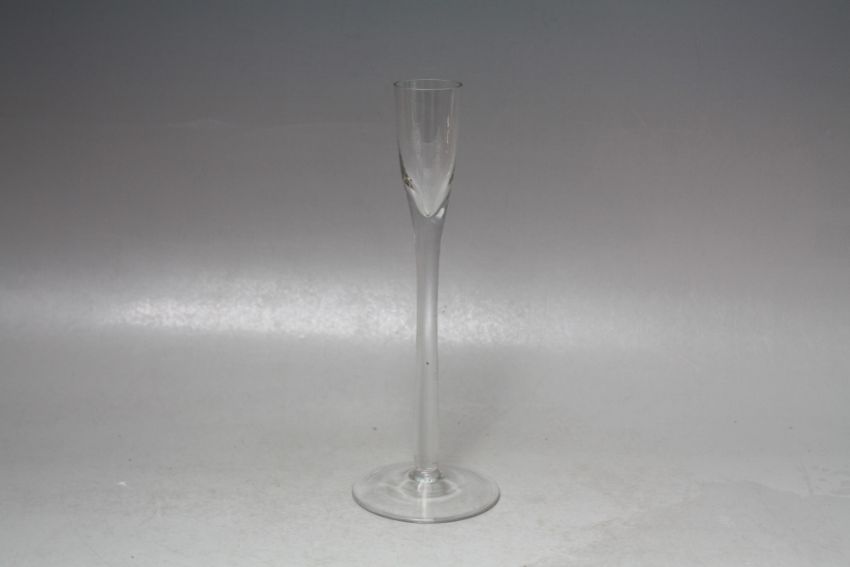 AN ANTIQUE GLASS SLENDER CORDIAL TYPE GOBLET, having an oversized circular foot supporting a slender stem and bowl, H 21 cm