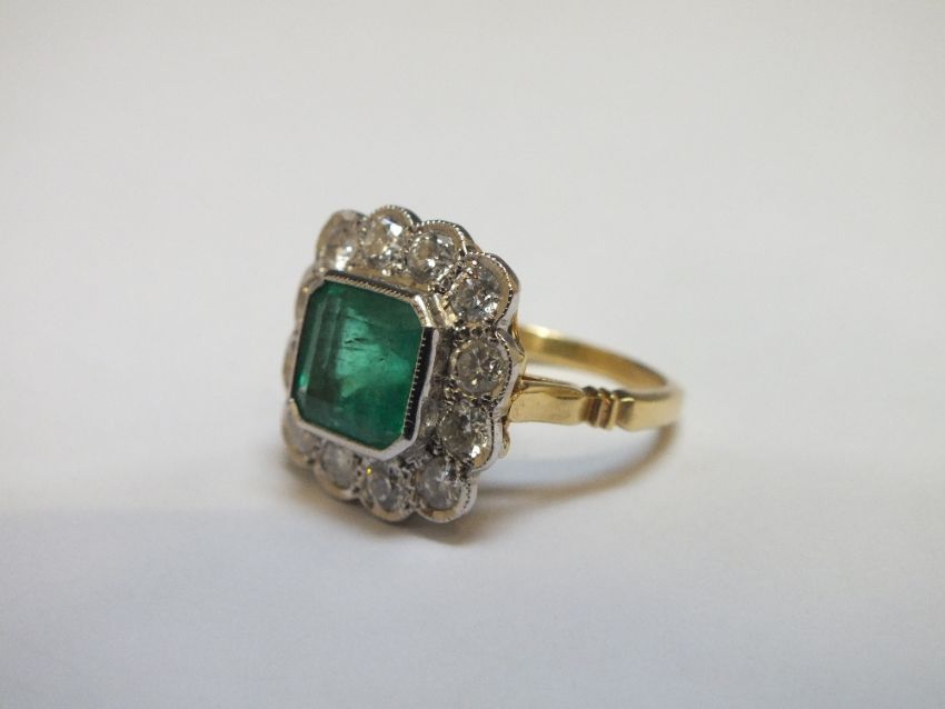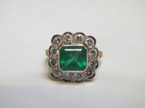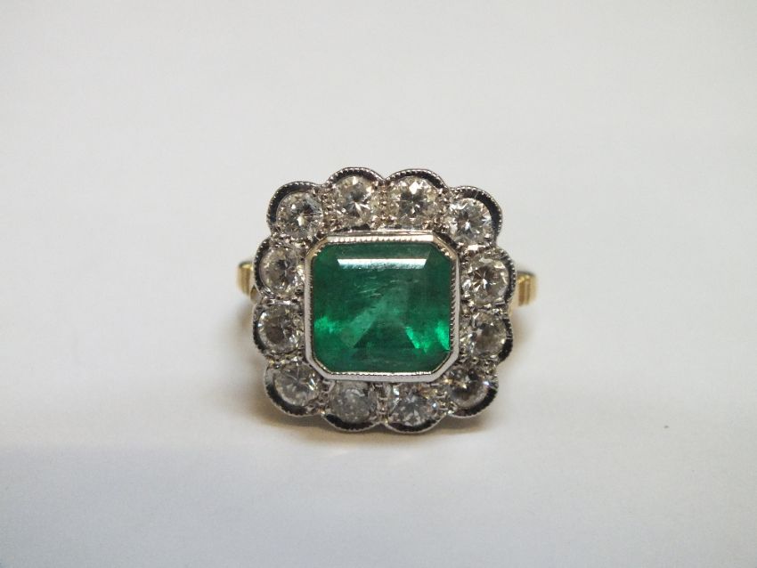 A PRINCESS CUT EMERALD AND DIAMOND RING, the emerald being surrounded by twelve brilliant cut diamonds, set in unmarked yellow metal, ring size M