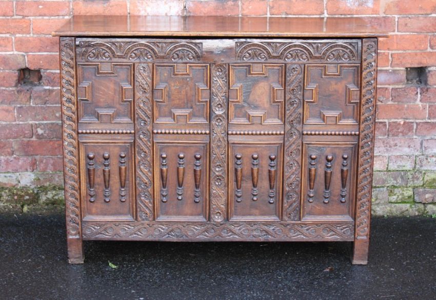 AN ANTIQUE OAK JACOBEAN STYLE DEEP COFFER, the hinged lift-up lid above a carved and moulded front, raised on stile supports, H 96 cm, W 129 cm, D 62 cm