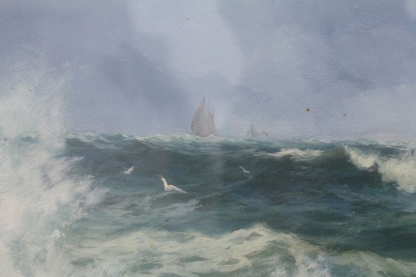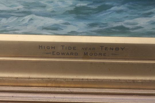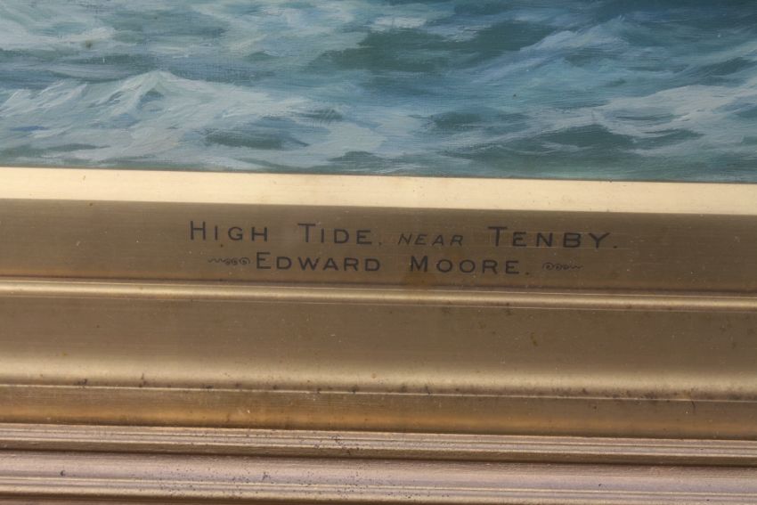 EDWARD MOORE (XIX-XX). Rocky coastal scene with heavy surf, 'High Tide near Tenby', signed lower right, oil on canvas, framed and glazed, 44 x 89 cm