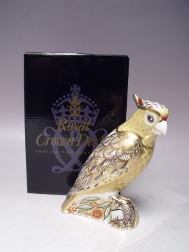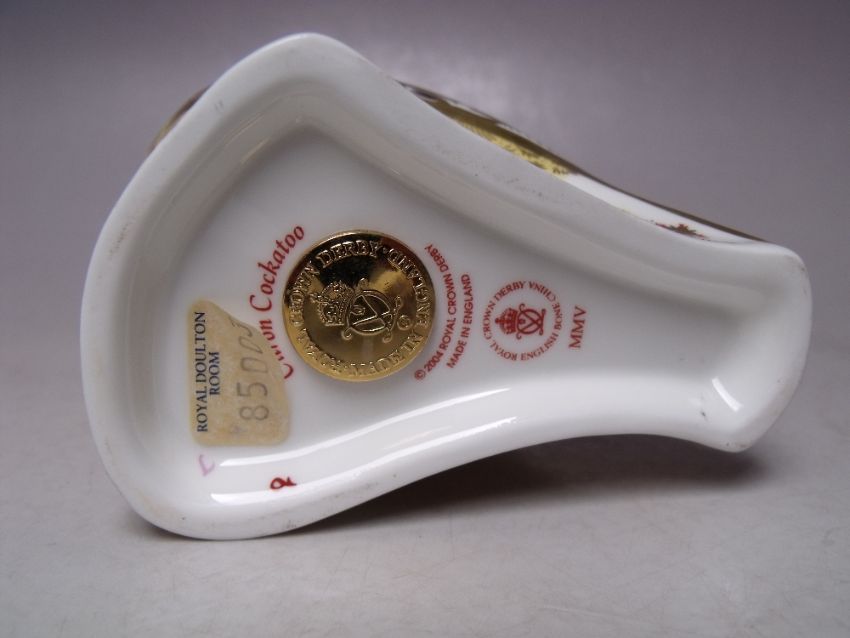 A ROYAL CROWN DERBY CITRON COCKATOO PAPERWEIGHT, gold stopper, with box, H 14 cm