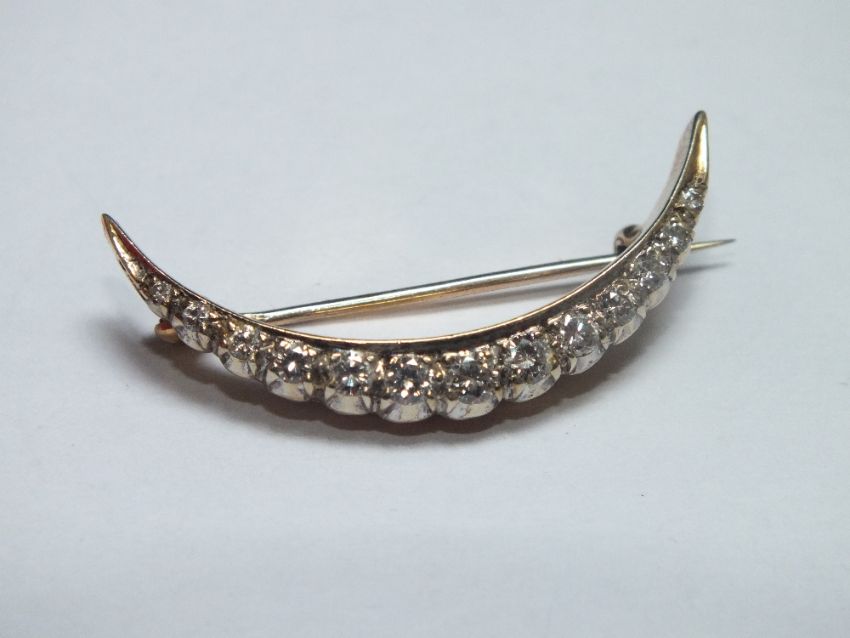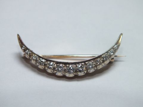 A HALLMARKED 9CT GOLD AND DIAMOND SET CRESCENT MOON SHAPED BROOCH, H 3.6 cm