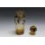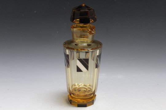 AN ART DECO GLASS DECANTER WITH ENAMEL DECORATION, pale amber coloured faceted body with black and silver enamel panels, complete with stopper, H 26 cm