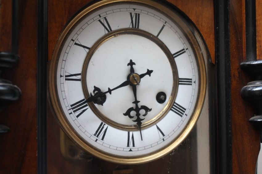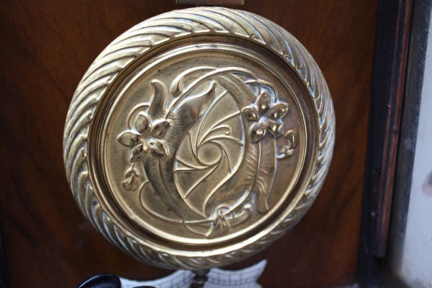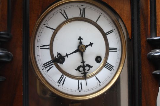 A LATE 19/EARLY 20TH CENTURY WALNUT VIENNA WALL CLOCK, the enamel dial with Roman numerals, carved mask head detail to the surmount, the decorative pendant with Art Nouveau detail, H 97 cm