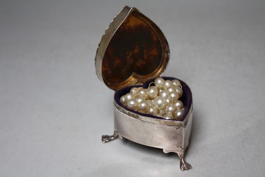 A HALLMARKED SILVER LIDDED VANITY JAR - BIRMINGHAM 1916, containing a small selection of vintage hat pins, together with a heart shaped hallmarked silver trinket pot with pique work to the tortoiseshell lid - Birmingham 1909 (2)