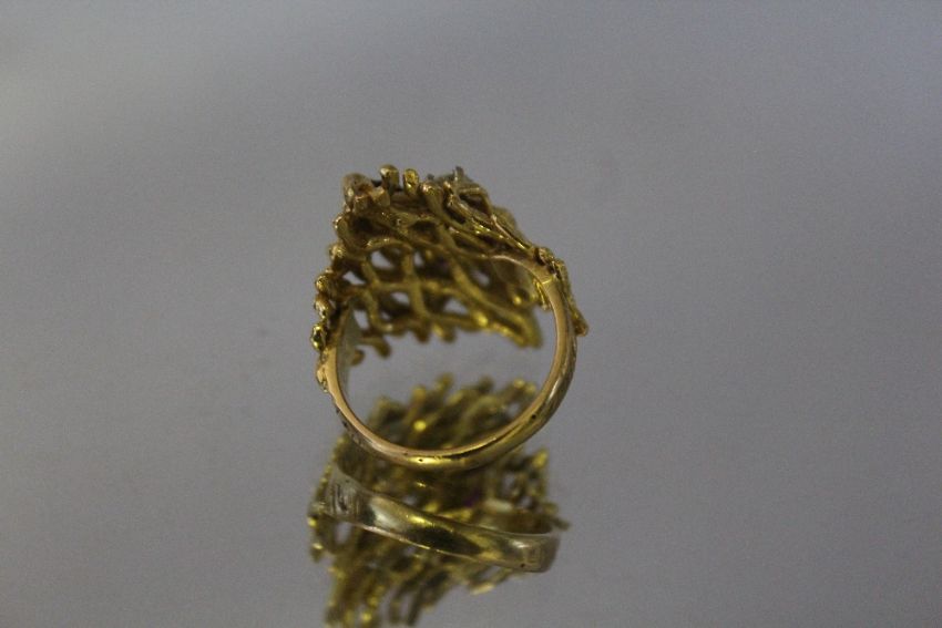 AN UNUSUAL NATURALISTIC DESIGNER STYLE RING, stamped 18ct and set with three rubies and a diamond, approx weight 10.9g, ring size O