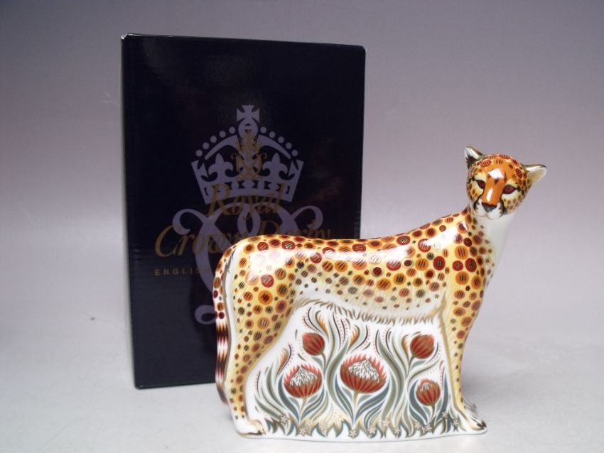 A ROYAL CROWN DERBY SIGNATURE EDITION CHEETAH PAPERWEIGHT, gold stopper, limited edition of 950, with box, W 15 cm, H 13 cm