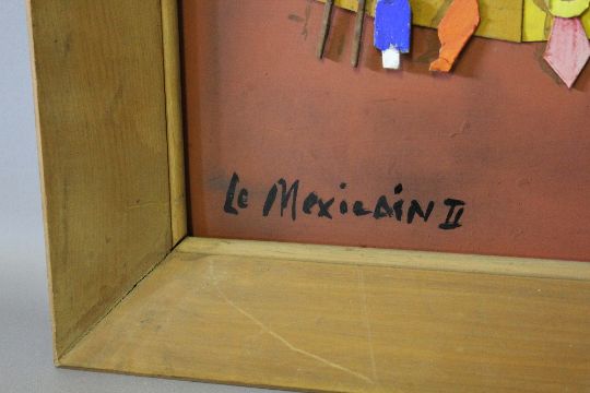 CIRCLE OF PABLO RUIZ PICASSO (1881-1973). Spanish school 'Le Mexicain II', bears signature and dated 1968 lower right, collage and mixed media on board, framed, 37 x 48 cm