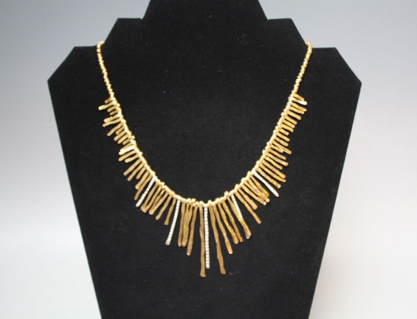 A ROBERTO COIN 18CT HALLMARKED 750 AND DIAMOND 'FRINGE' DESIGN COLLARETTE, in yellow and white gold, graduated 'matchstick' drops with random diamond set sections, diamond weight 0.41 ct, overall weight 63 g
