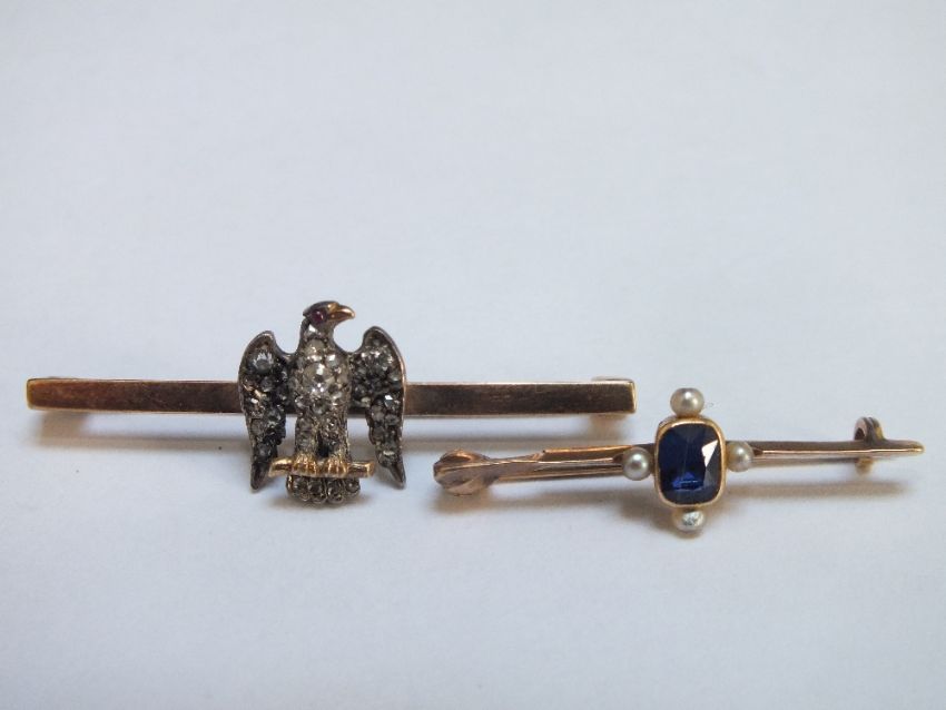 A 9CT GOLD BAR BROOCH WITH GEMSET EAGLE, W 4.1 cm, approx 3.4g, together with an unmarked yellow metal bar brooch with sapphire and seed pearl embellishment - 1.6 g (2)