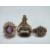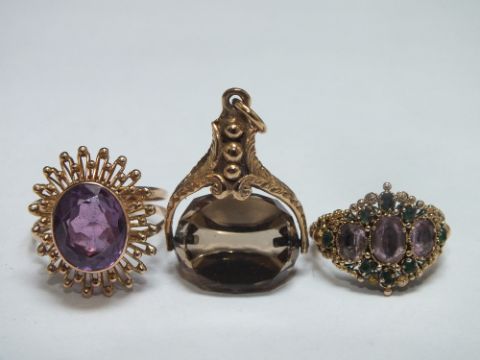 AN ANTIQUE STYLE GEMSET YELLOW METAL RING, together with an amethyst and yellow metal dress ring - marks indistinct, and a yellow metal swivel fob with faceted citrine (3)