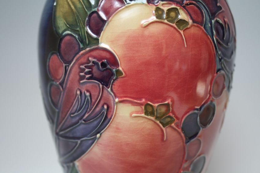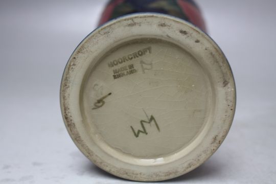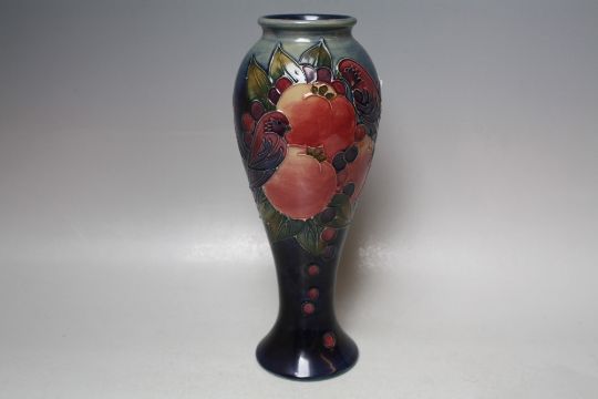 A MOORCROFT FINCHES PATTERN SLENDER BALUSTER VASE, impressed marks to the base and 'W.M' marks, H 28 cm