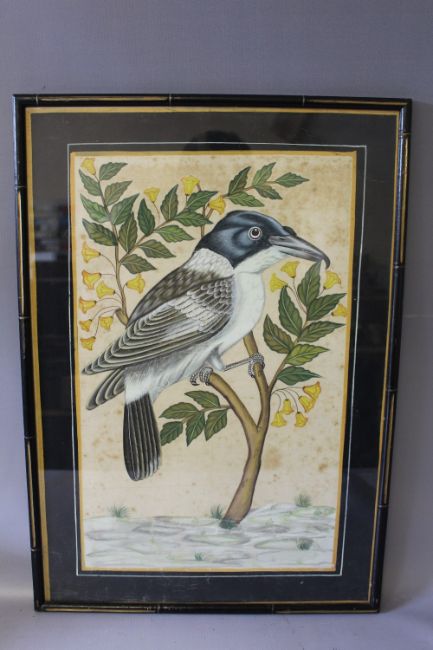 (XIX-XX). Eastern study of an exotic bird on a branch, unsigned, mixed media on material, framed and glazed, 47 x 29 cm