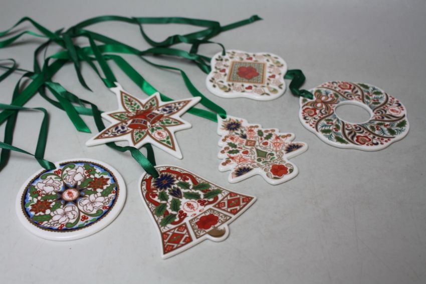 A COLLECTION OF SIX ROYAL CROWN DERBY CERAMIC CHRISTMAS ORNAMENTS, to include Christmas Tree, Star, Bell and Wreath examples, all boxed
