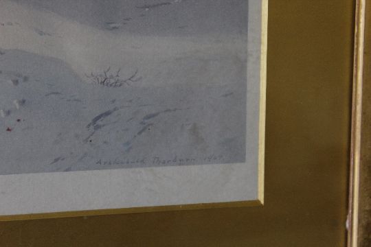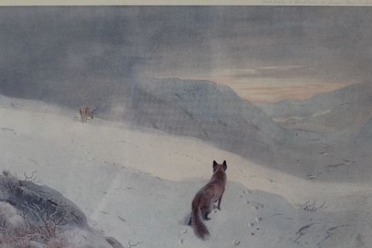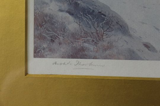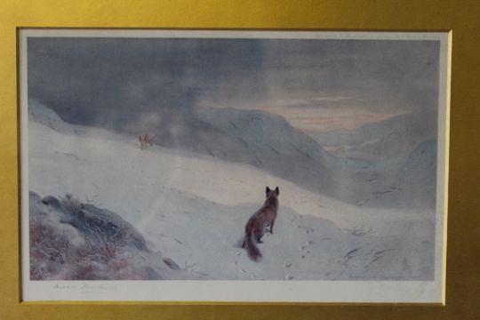 ARCHIBALD THORBURN (1860-1935). Mountainous winter landscape with fox and stag, signed in pencil lower left, coloured print on paper, framed and glazed, 25 x 39 cm