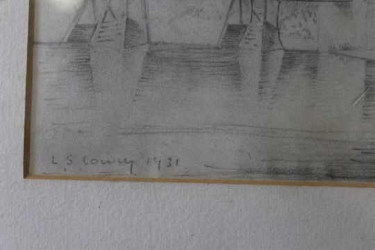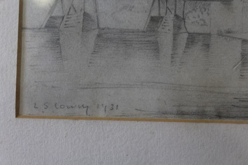 CIRCLE OF LAURENCE STEPHEN LOWRY (1887-1976). A riverside village scene, bears signature and date 1931 lower left, pencil on paper, framed and glazed, 19 x 24 cm