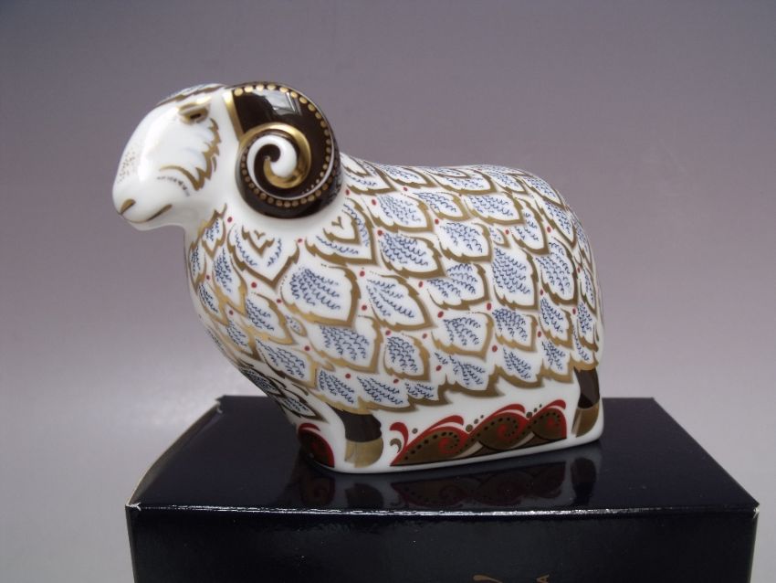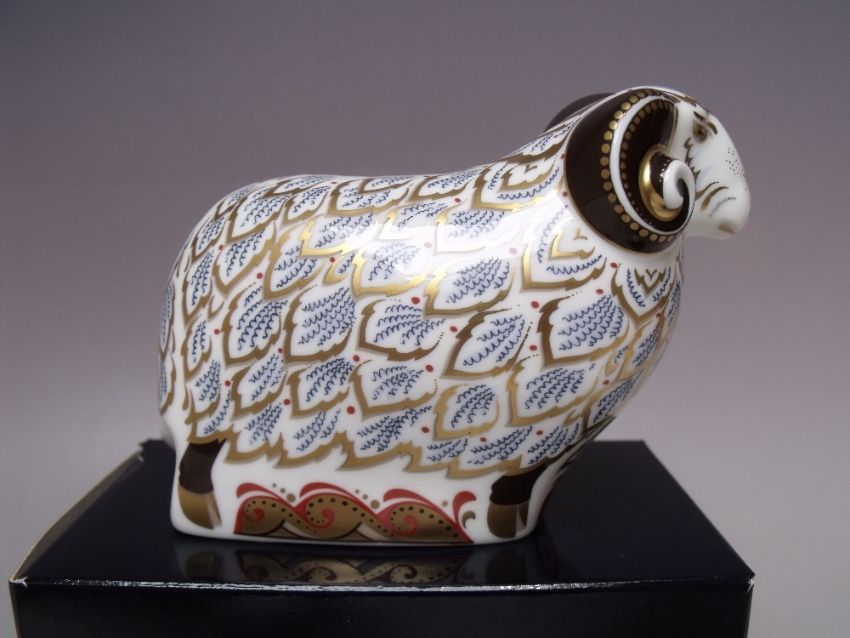 A ROYAL CROWN DERBY ONE OF A TIME LIMITED EDITION PREMIER RAM PAPERWEIGHT, exclusive to the Royal Crown Derby Visitor Centre, gold stopper, with certificate and box, W 12 cm