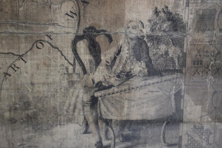 Condition Report: Linen backed but surface losses showing backing , very creased, staining