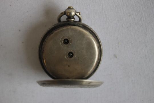 TWO LATE 19TH CENTURY WHITE METAL CASED FOB WATCHES, both with engraved cases.