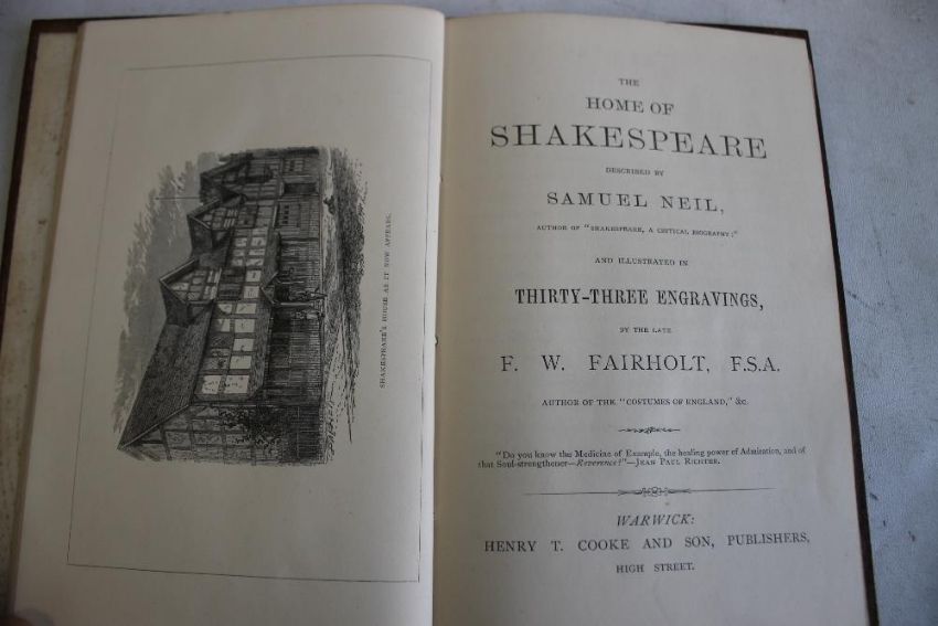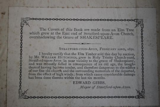"CATALOGUE OF PHOTOGRAPHS. ALBUM VIEWS, STEREOSCOPIC SLIDES GUIDES AND ILLUSTRATED BOOKS", published by H. T. Cooke & Son, High Street, Warwick, bound with "The Home of Shakespeare" described by Samuel Neil with engravings by F. W. Fairholt. the book has wooden covers with a bookplate which reads: "The Covers of this Book are made from an Elm Tree which grew at the East end of Stratford-upon-Avon Church, overshadowing the Grave of Shakespeare" Stratford-Upon-Avon, February 22nd, 1871 "I hereby certify that the Elm Timber sold this day by auction, by Mr William Hutchings, grew in Holy Trinity Church-yard, Stratford-upon-Avon in near vicinity to the grave of Shakespeare, and was recently felled in consequence of its old age, the boughs thereof having become tender, and therefore dangerous to the edifice of our fine old church and the surrounding memorials of the departed, from the effect of high winds; from which cause considerable damage has been done thereto within the last six months. Edward Gibbs, Mayor of Stratford-upon-Avon"