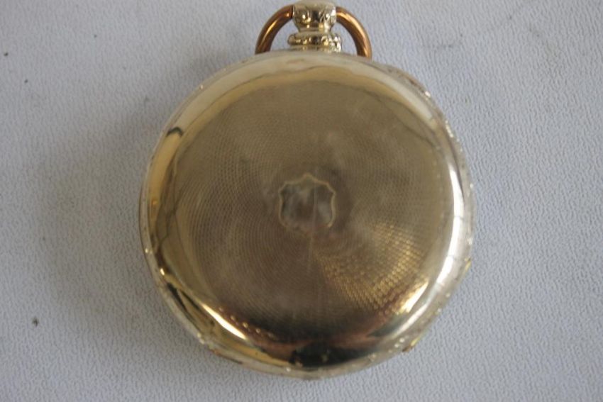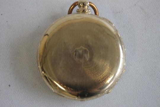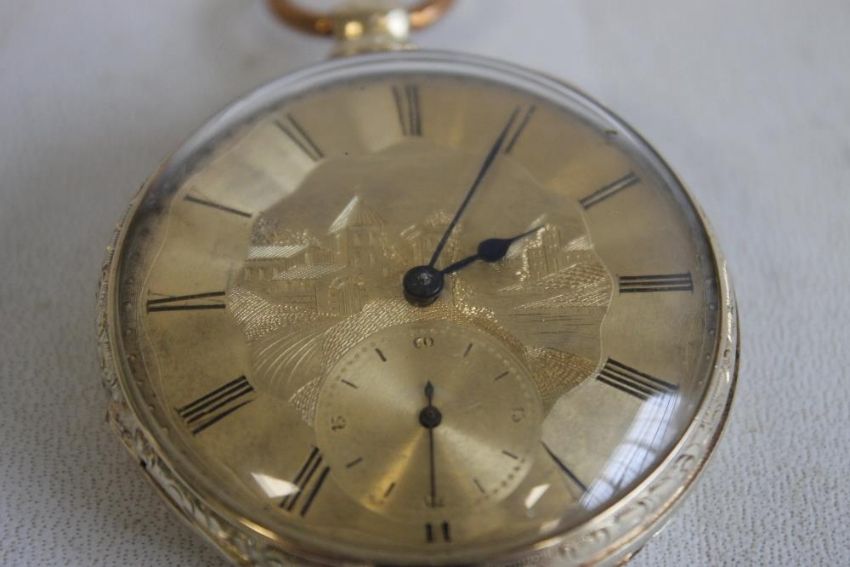 A YELLOW METAL GENTLEMAN'S OPEN FACE KEY WIND POCKET WATCH, gilt dial engraved with a scene of buildings, black Roman Numeral markings.