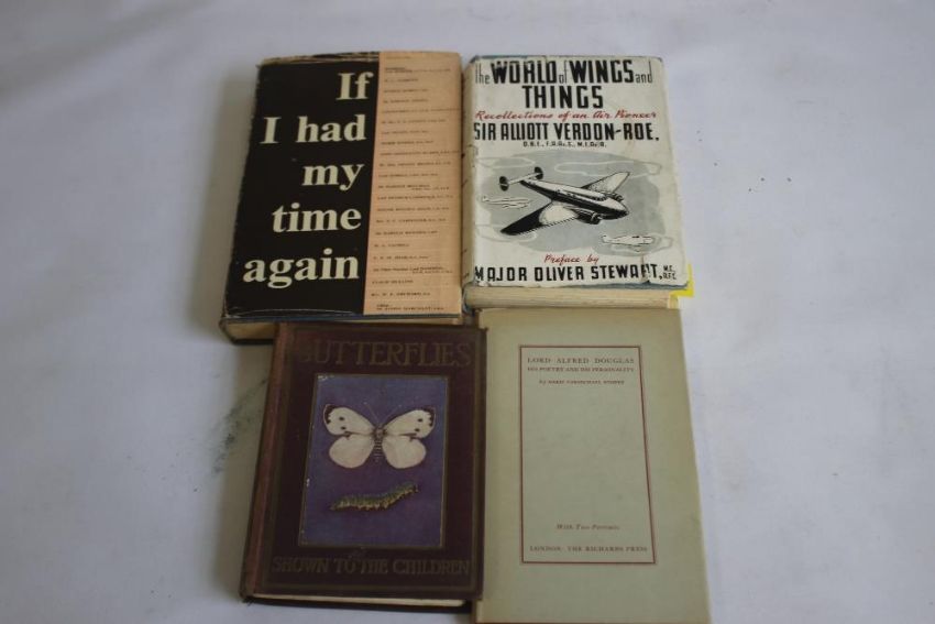 SIR ALLIOTT VERDON-ROE, Q.B.E. - 'THE WORLD OF WINGS AND THINGS' , published by Hurst and Blackett, with inscription "To Harry V. Stopes-Roe with love from Mummy Xmas 1939" together with Marie Carmichael Stopes - 'Lord Alfred Douglas' 1949 with inscription "To Harry with love from his Mother, the author Xmas 1949", 'If I Had My Time Again An Anthology contributed by twenty distinguished men and women' (including Marie Stopes) with inscription "Harry with best wishes from his Mother Marie C. Stopes Xmas 1950", 'Butterfies and Moths Shown to the Children' with inscription "With love from Mother Xmas 1926" (4)