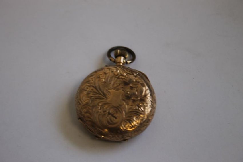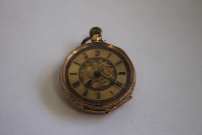 A LATE 19TH CENTURY CONTINENTAL LADIES' FOB WATCH MARKED 14ct, gilt engraved dial with black Roman Numeral markings, along with a white metal ladies' fob watch with silver dial and applied markers (2)