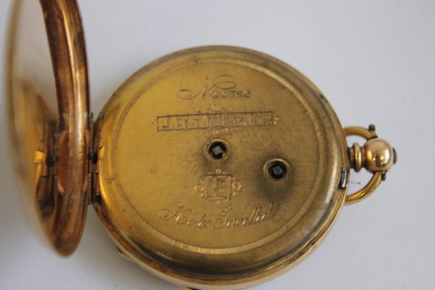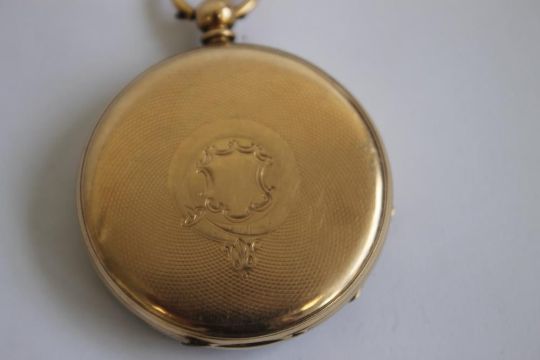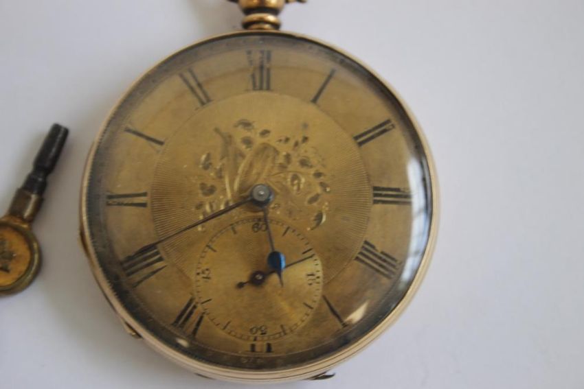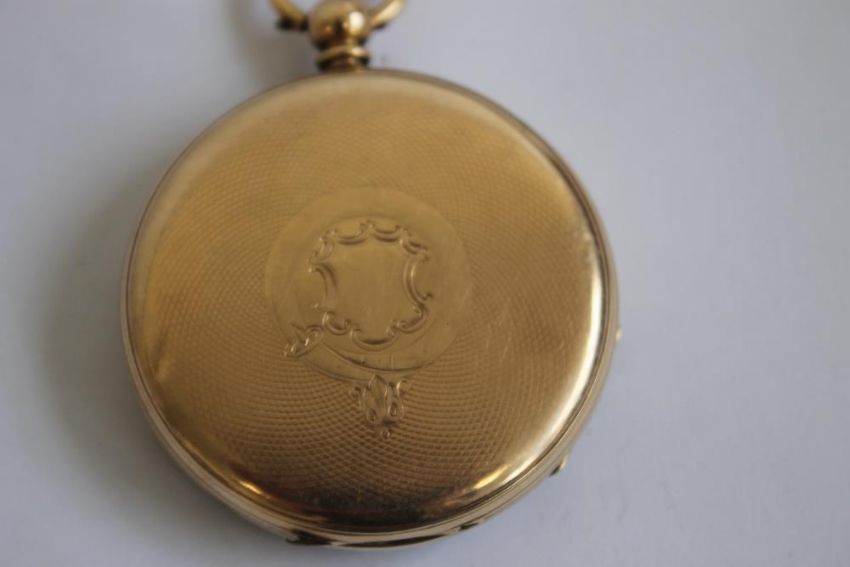A 19th CENTURY GENTLEMAN'S YELLOW METAL OPEN FACE, KEY WIND POCKET WATCH, gilt dial with black Roman Numeral markers.