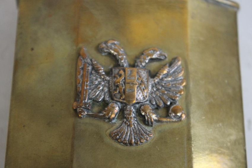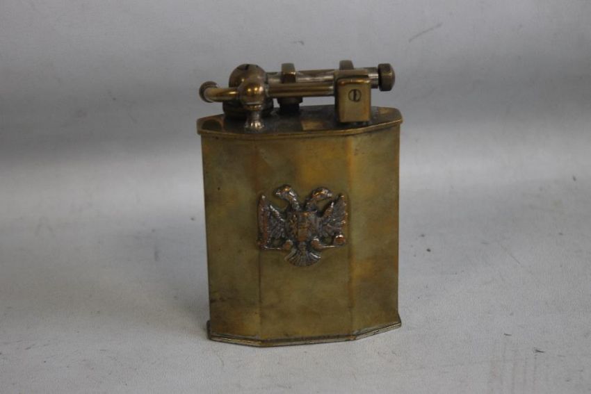 AN ANTIQUE FRENCH MINISTRE FINANCES BRASS LIFT ARM TABLE LIGHTER, with double headed eagle badge to the front