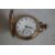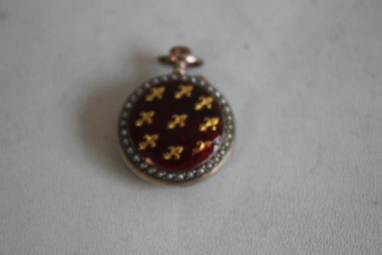 A CONTINENTAL GILT METAL ENAMELLED LADIES FOB WATCH, with pearl set bezel and borders along with a gold plated half Hunter pocket watch. (2)