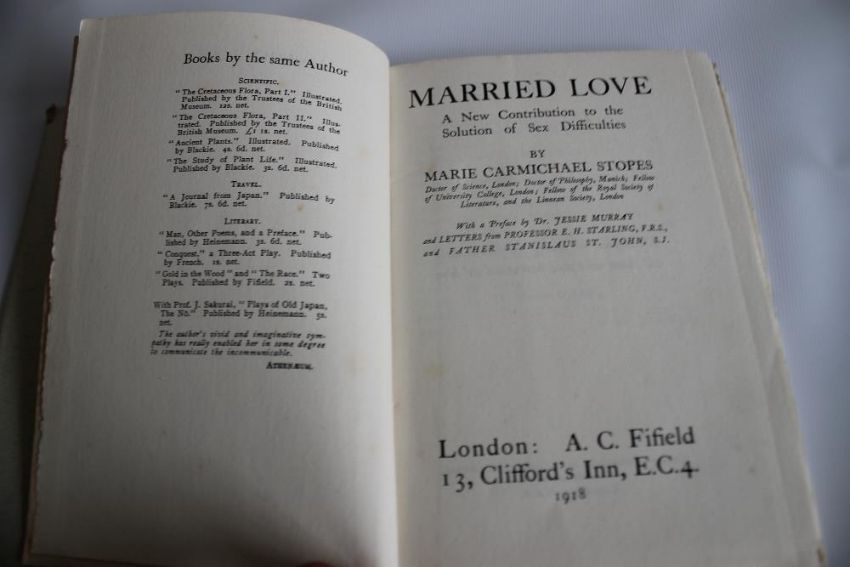 MARIE CARMICHAEL STOPES (SIGNED) - "MARRIED LOVE A New Contribution to the Solution of Sex Difficulties", London: A. C. Fifield, 13 Clifford's Inn. E.C.4. 1918, first edition in dustjacket with inscription "To the Winged One on his 40th Birthday from The Author" 18 April 1918"