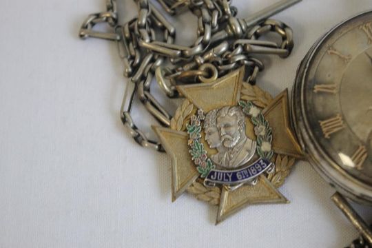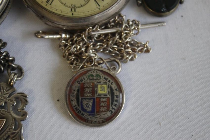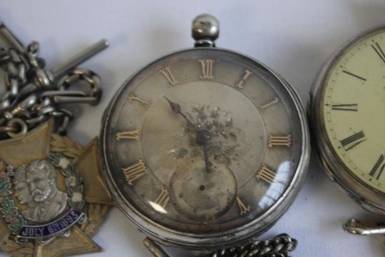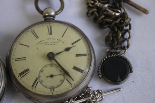A SILVER OPEN FACE KEY WIND POCKET WATCH, SIGNED THOMAS POWELL BATES, LIVERPOOL, along with another pocket watch A/F and a quantity of chains