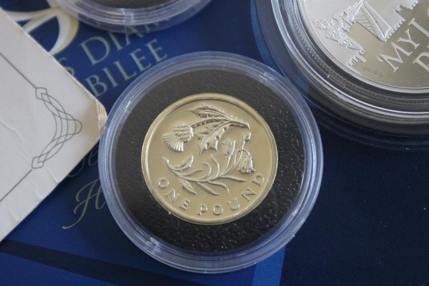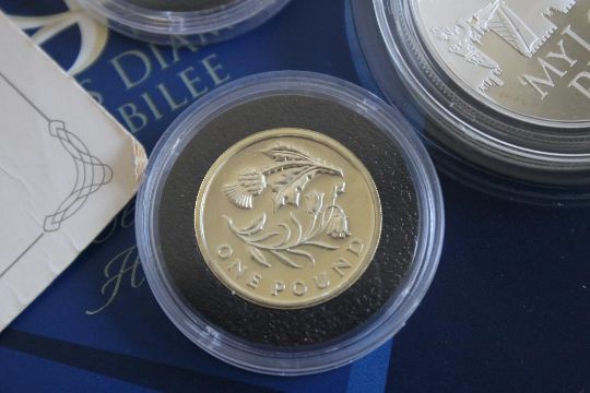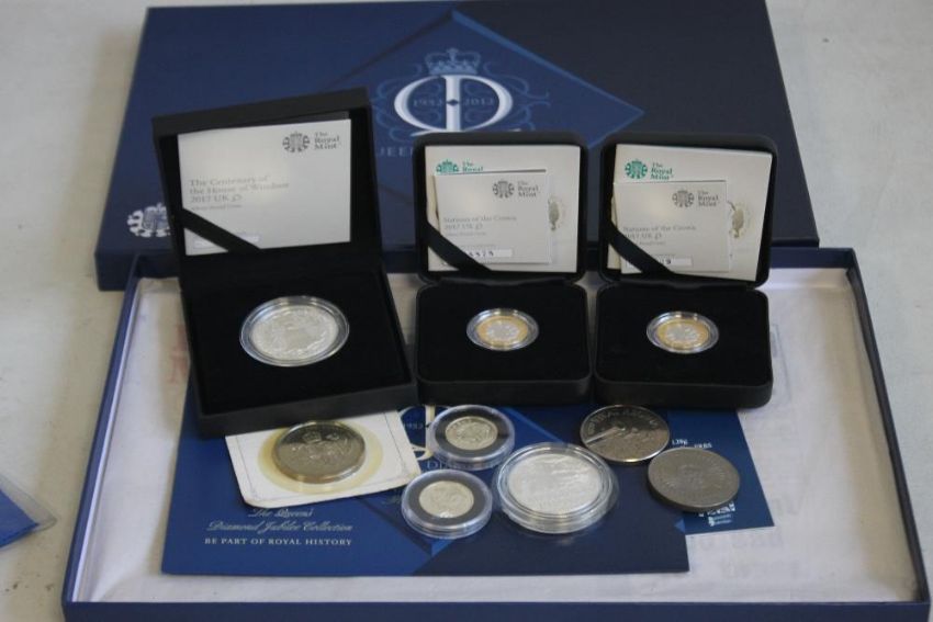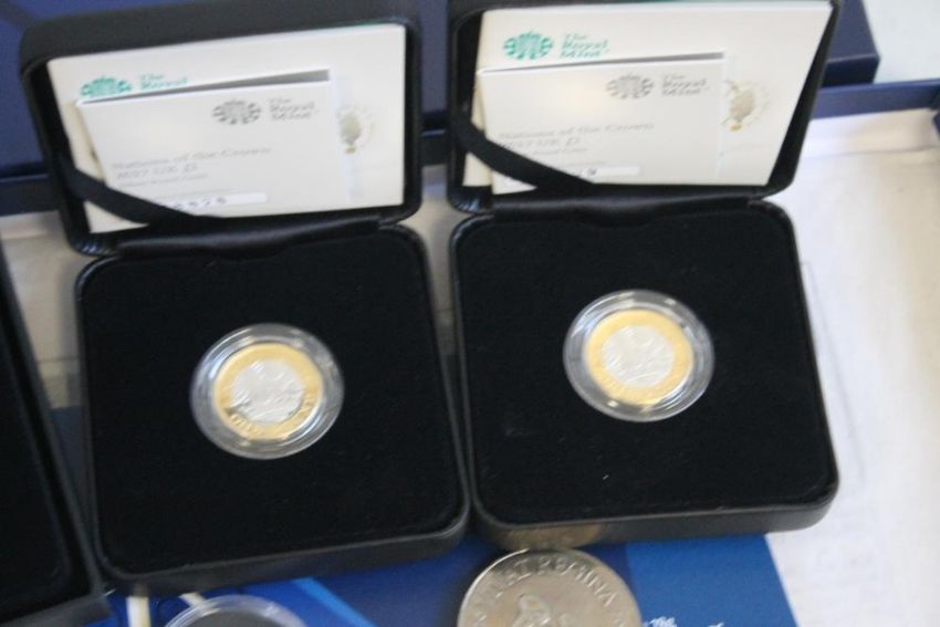 A QUANTITY OF BOXED COINS, 2 X 2017 silver proof £1, 2017 proof £5 coin and minor coins and holders.