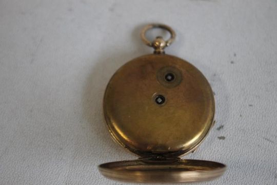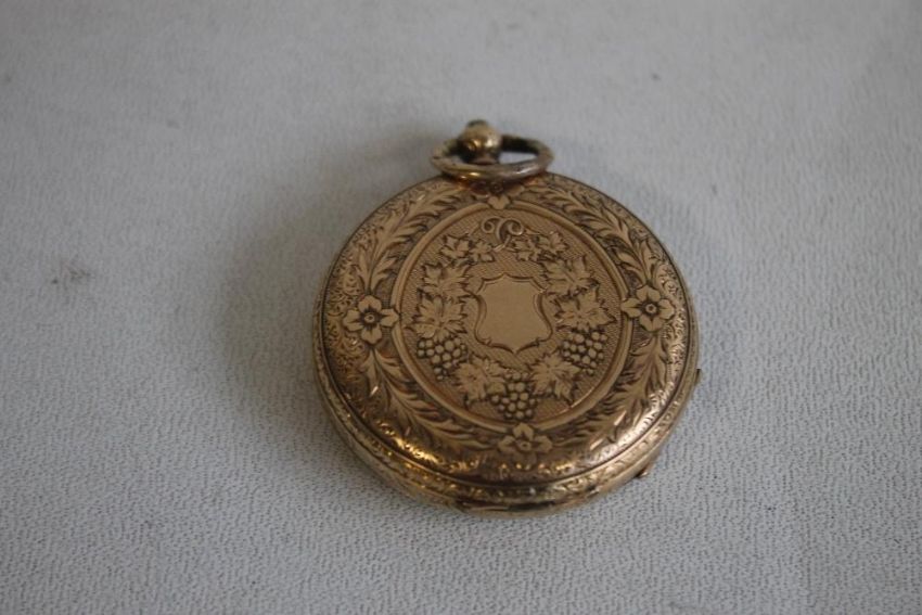 A YELLOW METAL (MARKED 14ct) OPEN FACE FOB WATCH, gilt engraved dial with applied markings.