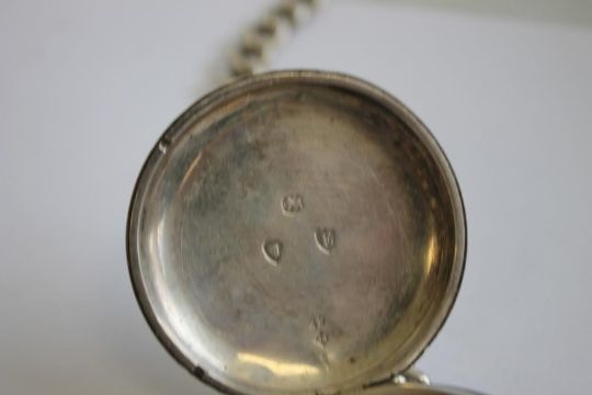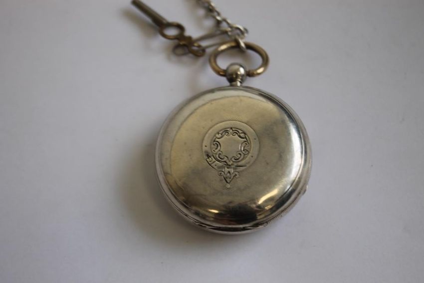 A SILVER OPEN FACE POCKET WATCH, (Unsigned) on a white metal Albert chain