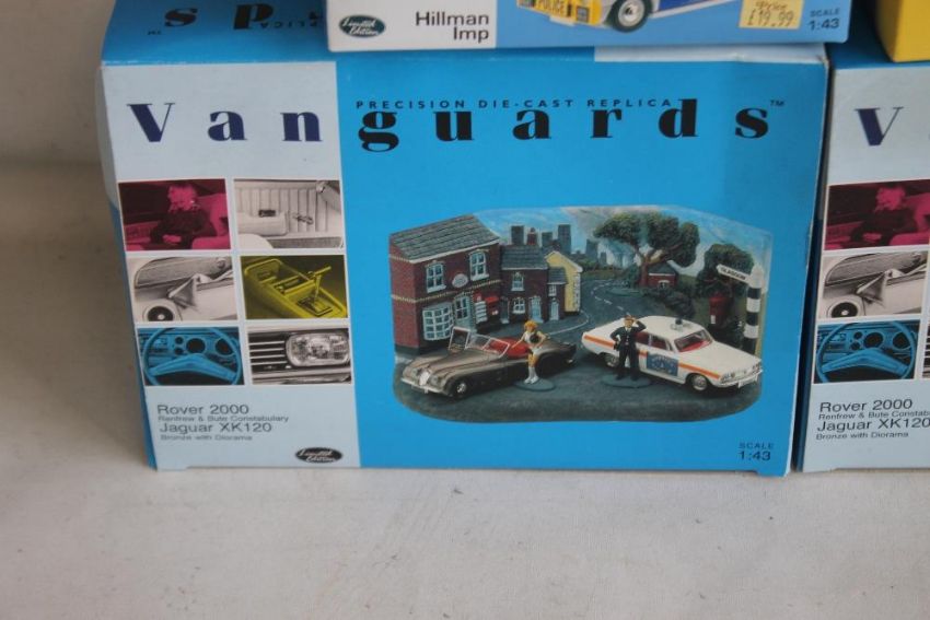 LLEDO VANGUARDS BOXED 1:43 SCALE POLICE VEHICLES ROVER 2000 RENFREW & BUTE CONSTABULARY & JAGUAR XK120 BRONZE WITH DIORAMA (2), together with Dunbarton Police "Pinky & Perky" Hillman Imp, Staffordshire Police Jaguar Mk2 3.8 & Jaguar XJ6 Series I 4.2, Rover 2000 and Austin 7 Mini (7)