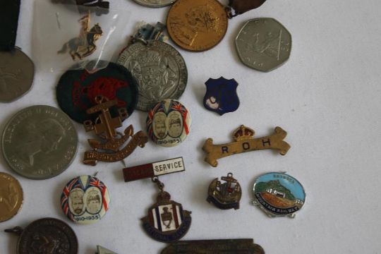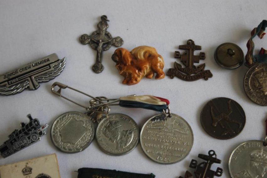 A BOX OF ASSORTED BADGES AND MEDALS, to include airline types, royalty, Boys Brigade etc